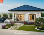 บ้านชั้นเดียวสไตล์คอนเทมโพรารีมินิมอล เน้นความโปร่งโล่ง ตัวบ้านโดดเด่นด้วยหลังคาทรงปั้นหยาโทน เสริมความทันสมัยด้วยบัวผนังและการเล่นลวดลายเส้นสายที่เรียบง่าย แต่มีมิติ
